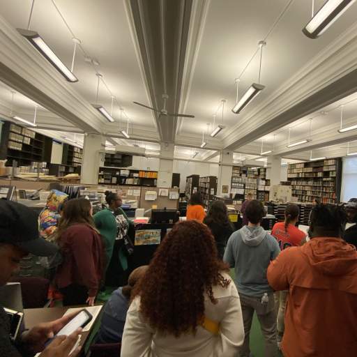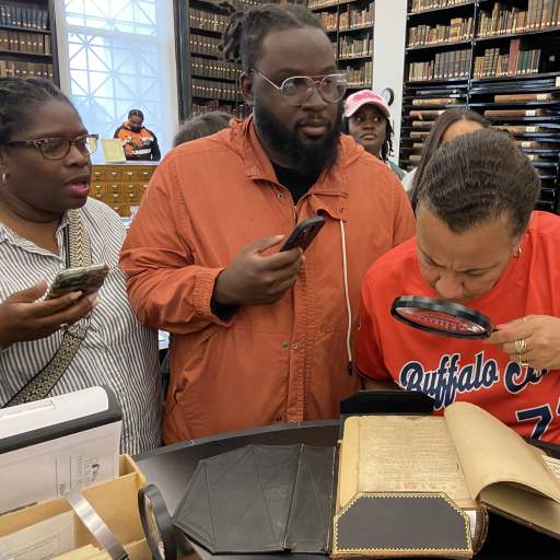 The group visited the future site of the Open Buffalo Urban Ecology Campus & Climate Resilience Hub in the Broadway-Fillmore neighborhood, where Athenia Cyrus, current Emerging Leader and founding member of the Open Buffalo Eco Collective, led the group in imagining the Climate Justice oasis Open Buffalo is working to build. We examined the division of the once-prosperous Hamlin Park neighborhood as we rode from MLK Park at Fillmore & Best up the NY-33 and Scajaquada Expressways to the Buffalo History Museum. A tour of the museum’s research library introduced the leaders to materials in the collection illustrating the history of justice movements in Buffalo.