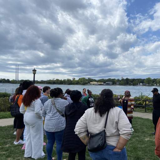 After lunch on the museum’s portico, the leaders rode through the West Side, viewing one of the last remnants of Buffalo’s Olmsted Parkway system and talking about Eco Justice projects and PUSH Buffalo’s resident-led housing justice work. We visited Freedom Park where Sabriyah Lailla Smith (EL 2024) led us in a libation ceremony honoring the ancestors who lost their lives crossing the Niagara River to freedom. The bus then headed down Niagara Street while cohort member Maritza Vega, Vice President of the Hispanic Heritage Council of WNY, shared with the group about the creation of the Hispanic Heritage Corridor. We visited Tifft Nature Preserve, drove through the Irish neighborhoods of South Buffalo, and took a walking tour around several of the anchor sites of the Michigan Street African American Heritage Corridor.
