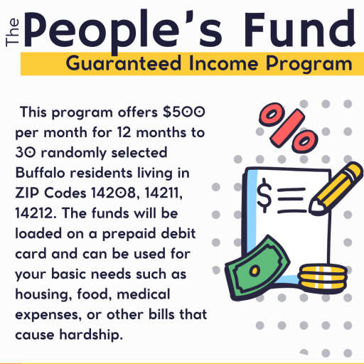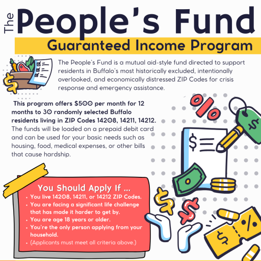 The People’s Fund is a mutual aid-style fund directed to support residents in Buffalo’s most historically excluded, intentionally overlooked, and economically distressed ZIP Codes for crisis response and emergency assistance. The funds will be loaded on a prepaid debit card and can be used for basic needs such as housing, food, medical expenses, or other bills that cause hardship.
