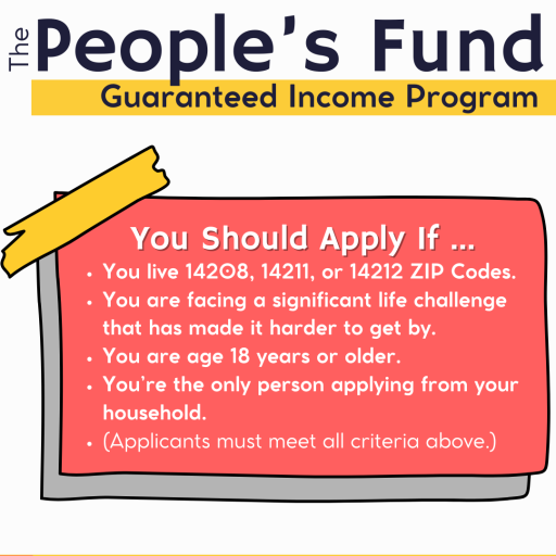 As a proud founding member of the Crossroads Community Fund (CCF), Open Buffalo is overjoyed to announce the *NOW OPEN* application for the People’s Fund guaranteed income program! In this pilot phase, the People’s Fund will be distributing monthly $500 infusions to 30 households in need within our city’s 14208, 14211, and 14212 ZIP Codes. Recipients will be selected randomly after meeting the following basic eligibility criteria: